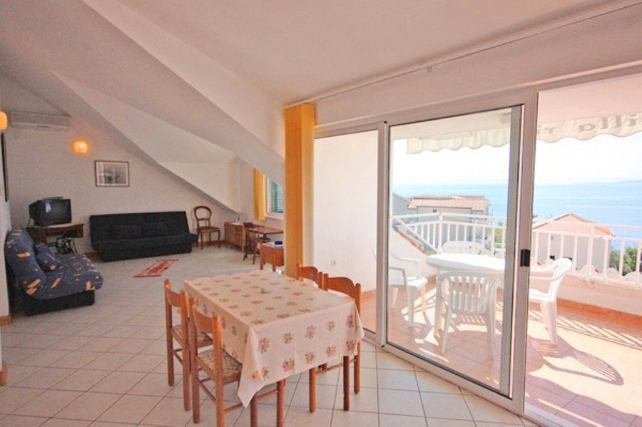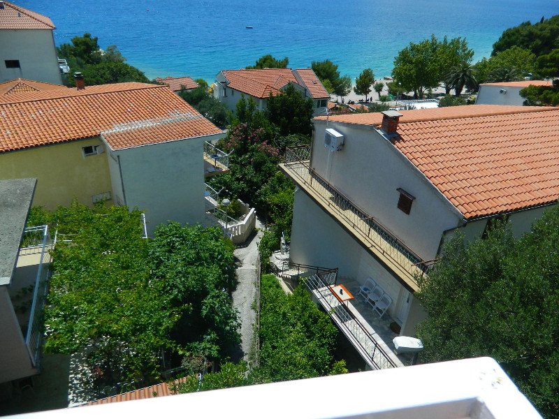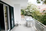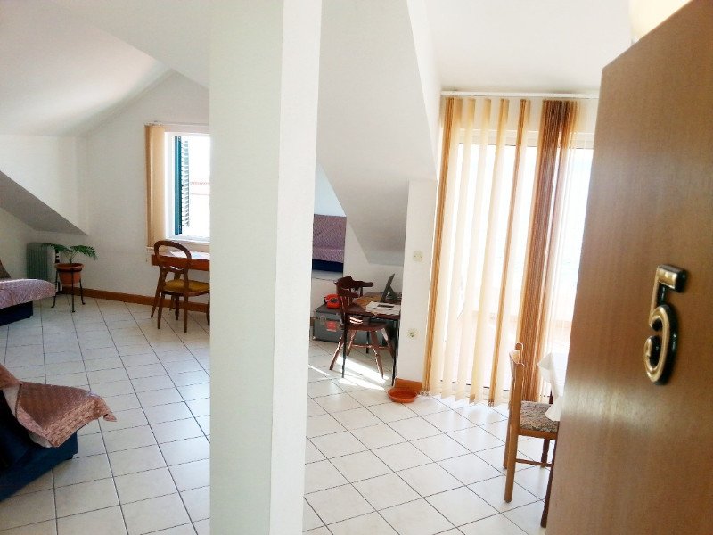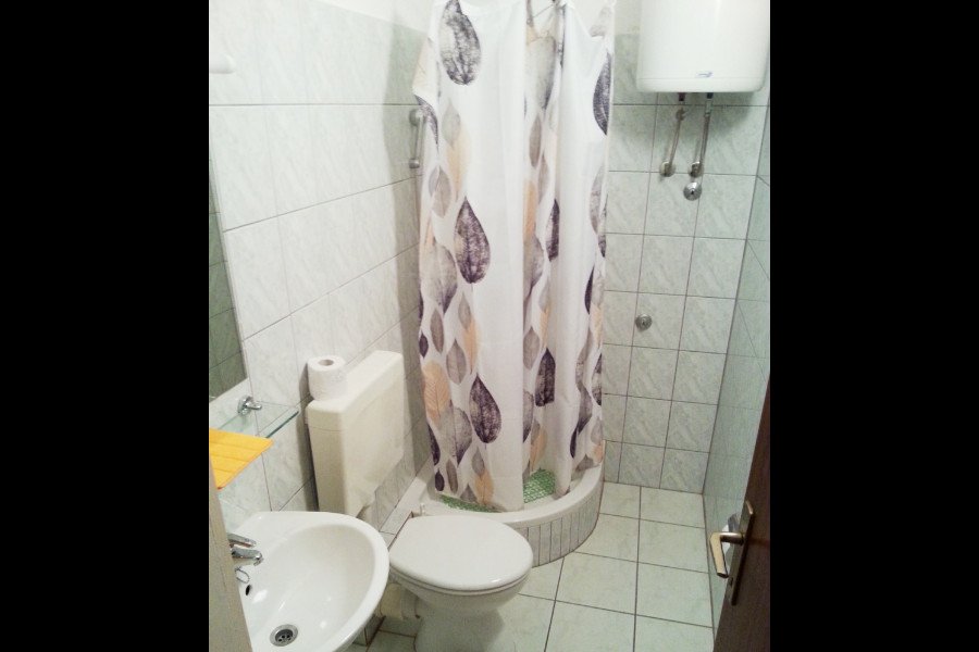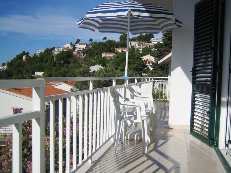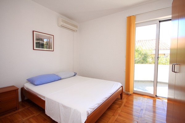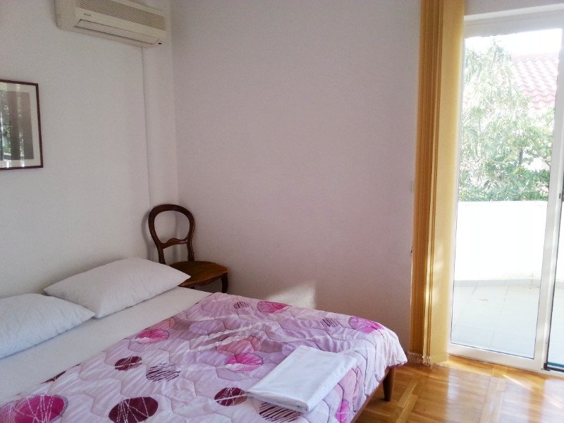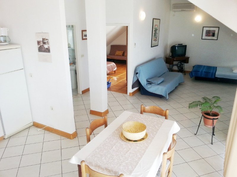 Villa on a great location offer three apartments large and comfortable with beautiful terraces overlooking the sea. Great price for comfort. Only two minutes walk to the beach and the center. Capacity: 2 x AP4 + 2 (each with 2 bathrooms), AP3 + 2 • Location: beach 60m, center 100m, restaurant 60m, cafe bar 60m, shop 60 m • Equipment: air conditioning, satellite TV, BBQ, hairdryer, wireless internet • balcony, terrace, sea view • Parking: Private, 150m distance from house, for charge € 6 per day